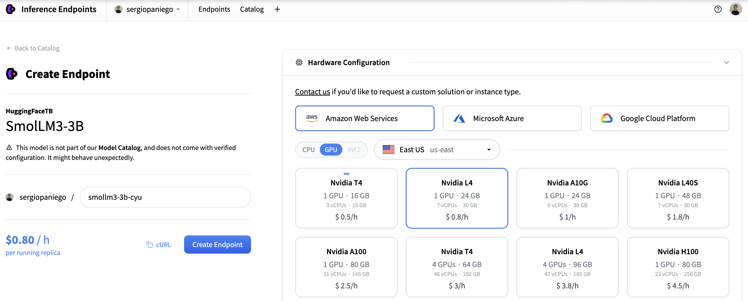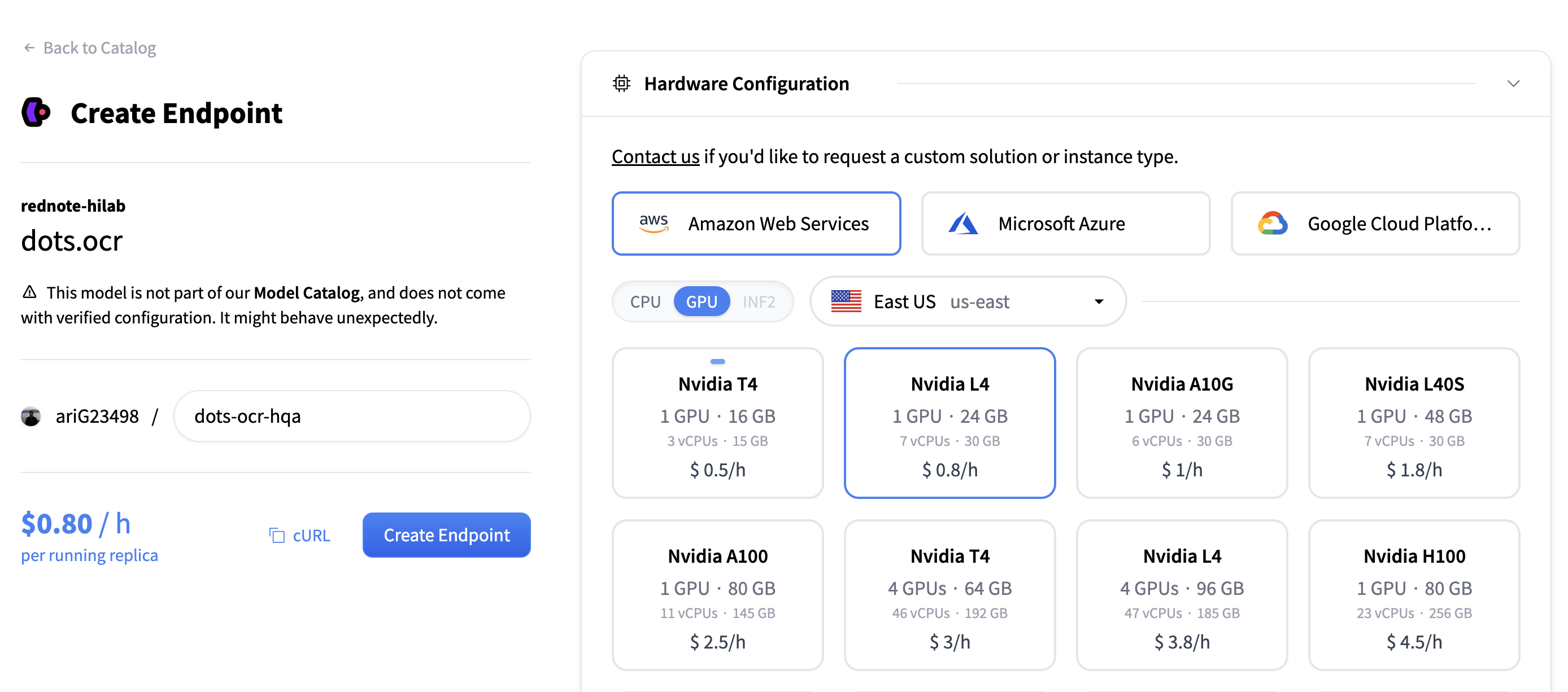 为此演示,我们选择 AWS 和 L4 GPU。根据您的硬件需求进行调整。 -
