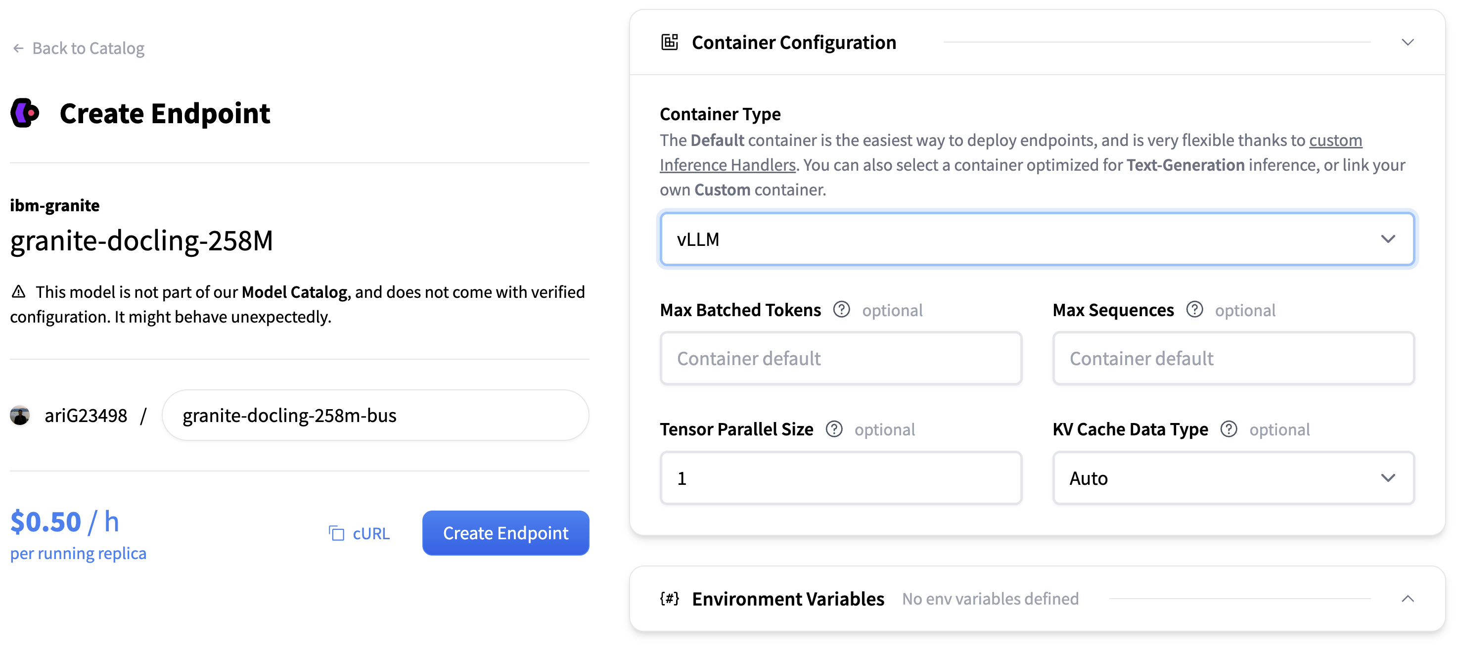 目录提供了针对 vLLM 优化的模型,包括 GPU 设置和推理引擎配置。您可以从推理端点 UI 监控端点并更新 容器或其配置。
